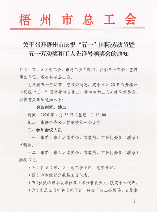 關(guān)于召開梧州市慶?!拔逡弧眹H勞動(dòng)節(jié)暨五一勞動(dòng)獎(jiǎng)和工人先鋒號(hào)頒獎(jiǎng)大會(huì)的通知